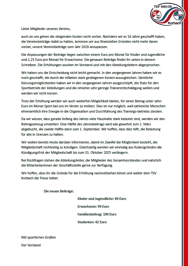 Wir hoffen, dass ihr die Gründe für die Erhöhung nachvollziehen könnt und weiter dem TSV Korbach die Treue haltet.